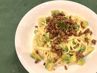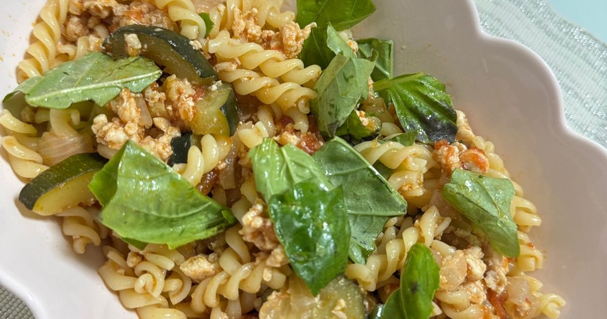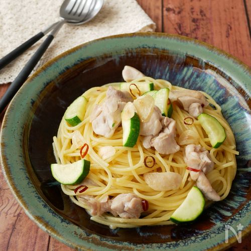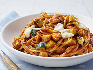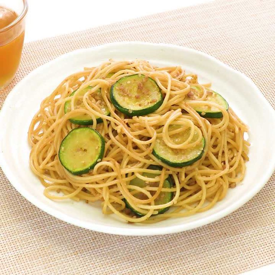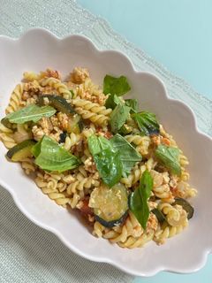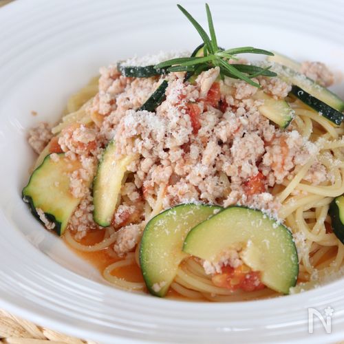 ランチにぴったり! 鶏ひきとズッキーニのミートパスタ。