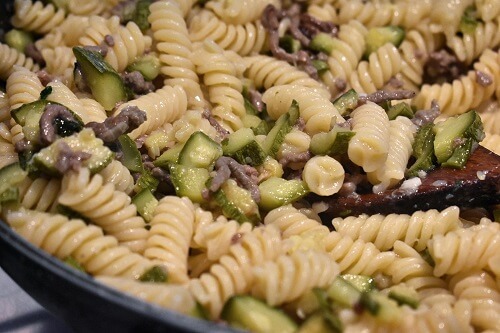 フライパンひとつで作れる!鶏ひき肉とズッキーニのチーズパスタ。
