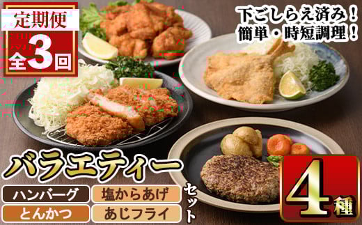 定期便・全3回>下ごしらえ済みおかず バラエティーセット 4種4ヶ月ごとにお届け肉 魚 ハンバーグ からあげ 唐揚げ とんかつ あじフライ 冷凍惣菜 お弁当 簡単 時短 定期便 DH277株 ネクサ大分県佐伯市セゾンのふるさと納税。