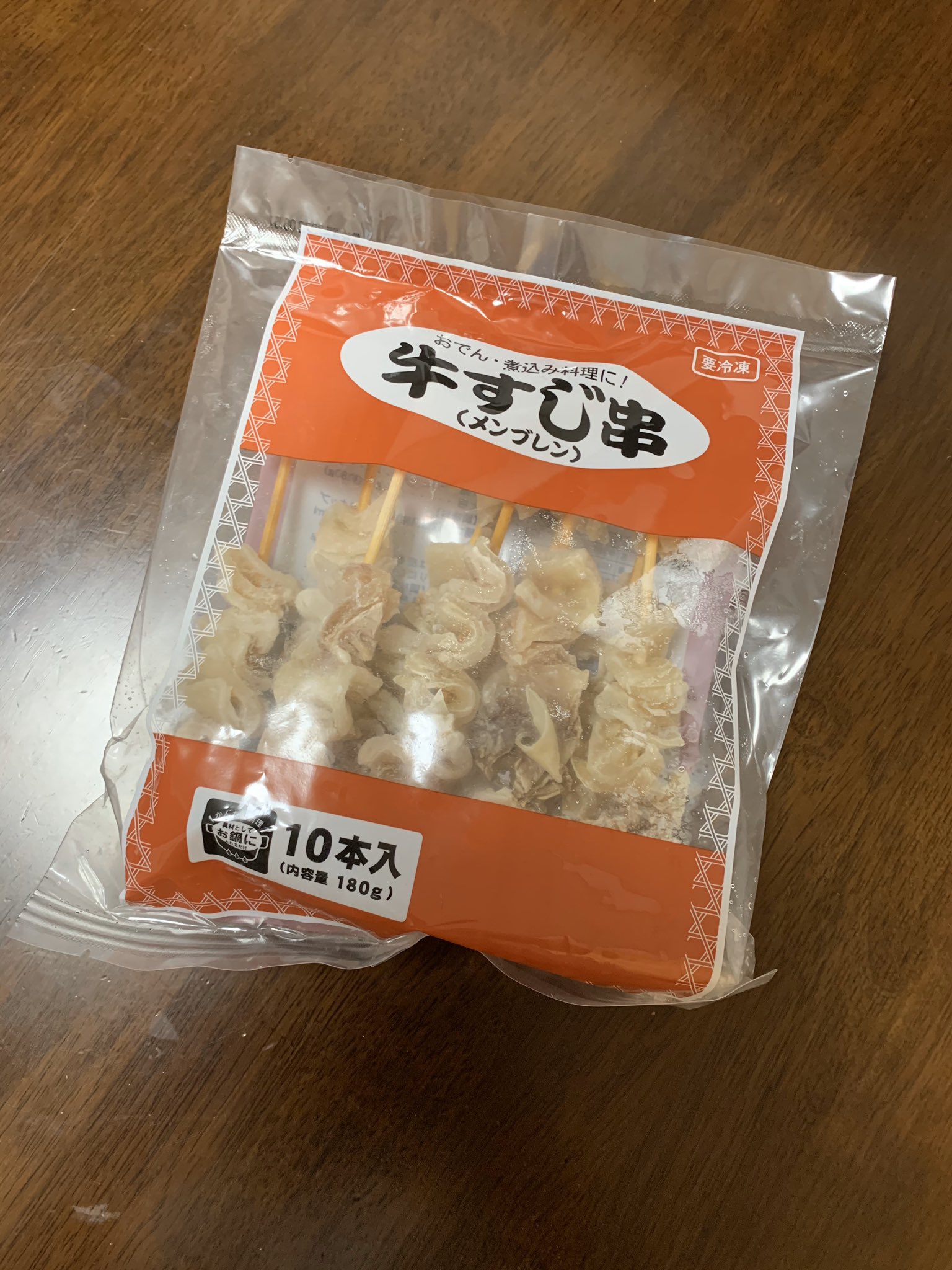 業務スーパーで「牛すじ串」を購入しました🍢 牛すじ串 税別😁398円・内容量10本入り 産地 中国産 業務スーパーで購入した 牛すじ串をおでん使ってみました🍢 串に刺さった状態で冷凍されてるから、そのまま入れるだけ👍 味は、コリコリして弾力がクセに。