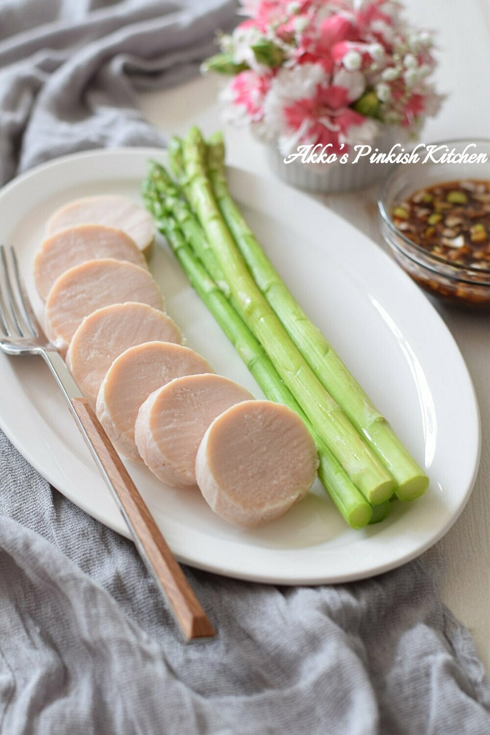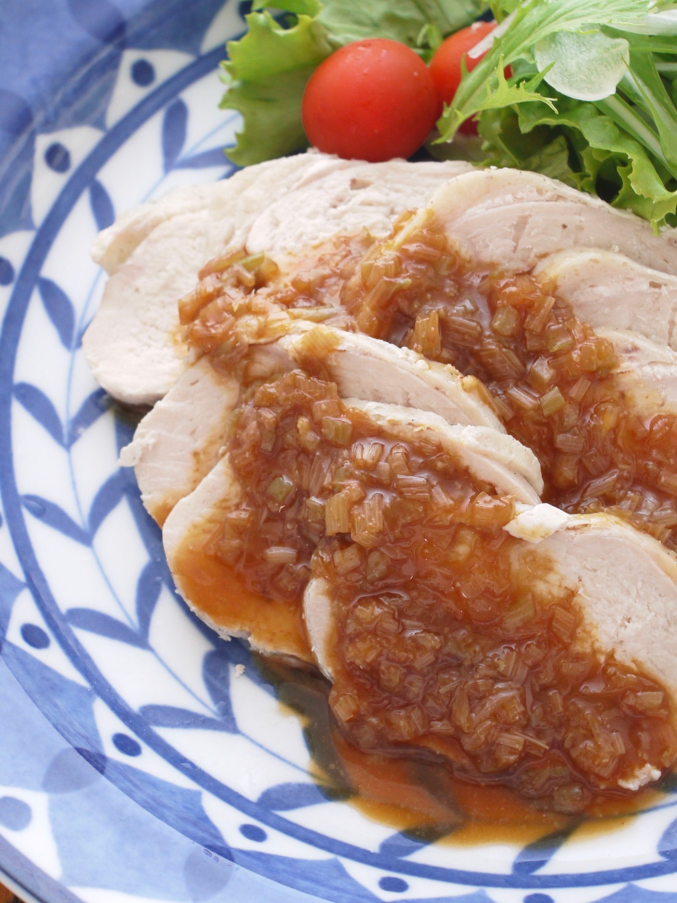 おもてなし 簡単♡基本の『鶏ハム』コチュジャン風味のネギたっぷりソースアッコさん家の彩りレシピ アメリカLAスタイル。