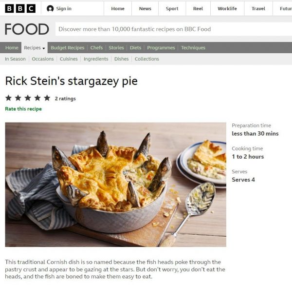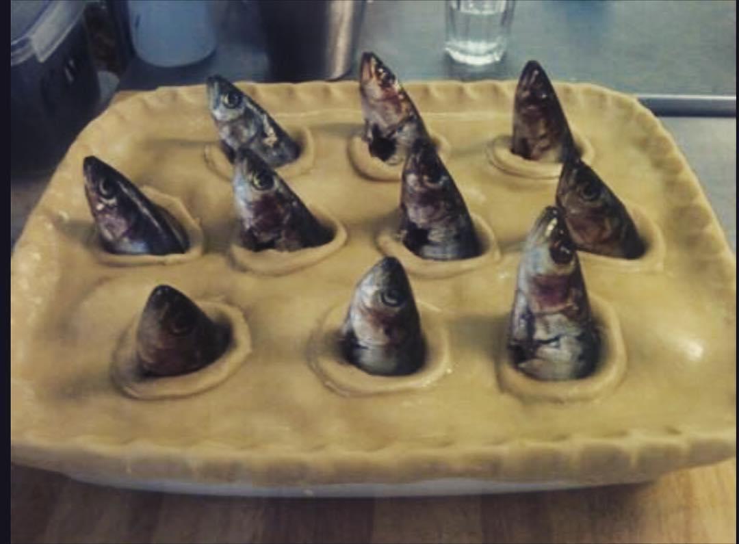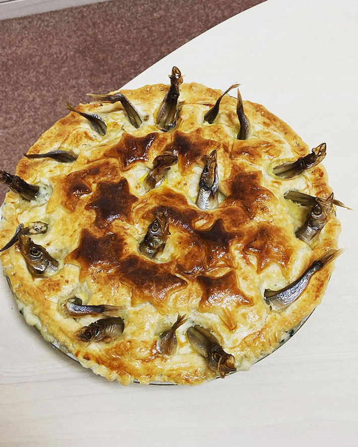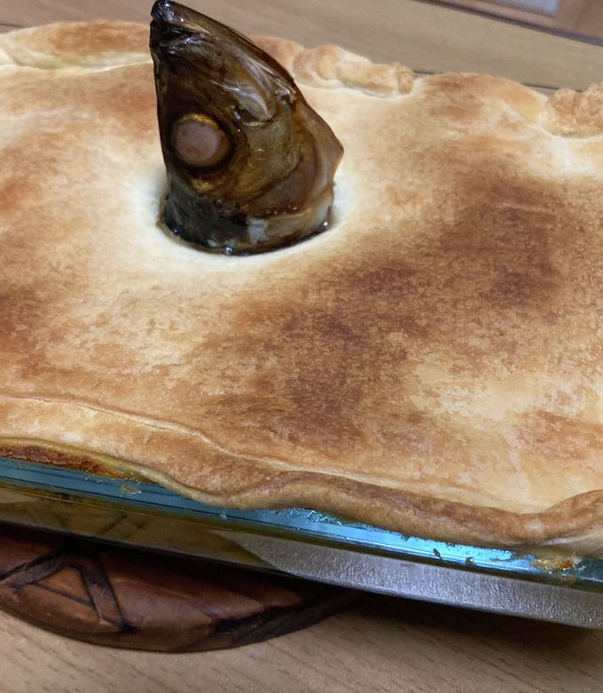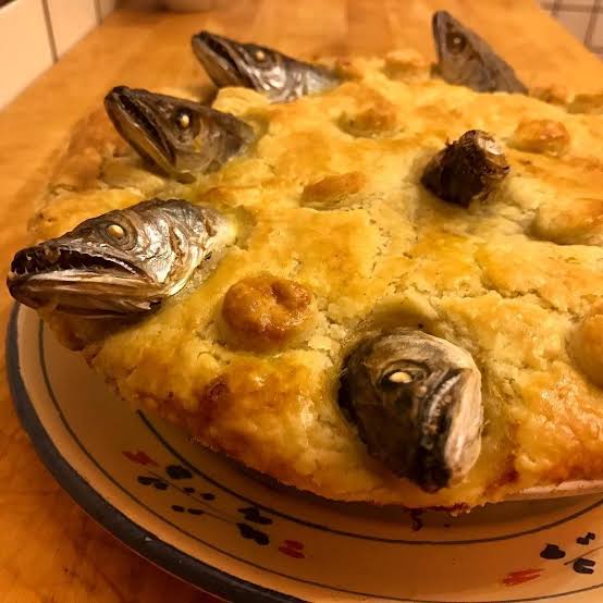 オールドアロウ on X: "英国ゲテモノ料理としてよく茶化されてるスターゲイジー パイですが、英国料理を作る店として言わせてもらいます。嵐の日に皆のため命をかけて魚をとりに行った漁師のため、彼がとってきた魚が彼に見えるよう、わざわざニシンが付き出した姿になっ。