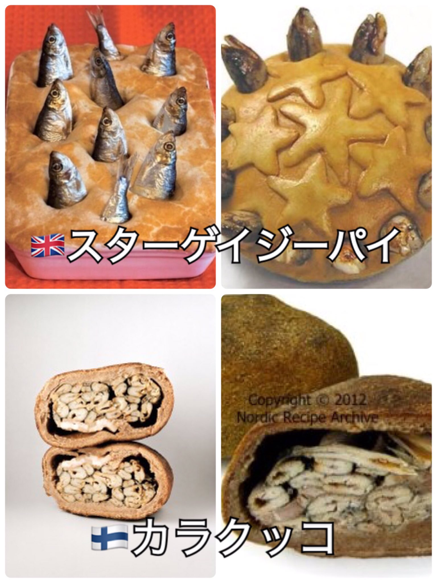 せかいのクリスマス頃の料理🎅, 「スターゲイジーパイ」は、イギリス南西部のコーンウォール州・マウゼル発祥の料理⭐️,地元の英雄トム・バーコックさんをたたえて毎年12月23日に食べるのだそう✨,魚たちが星を見つめている姿をしたユニークなパイですが、同じイギリスでもロンドンなどでは滅多に食べることができないのだとか👀。