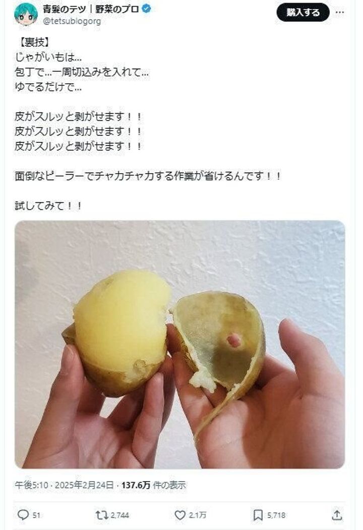 包丁を使わず「じゃがいも」の皮を薄く剥く方法!?元スーパーの店員が教える裏ワザ ぱるとよ- エキスパート - Yahoo!ニュース。
