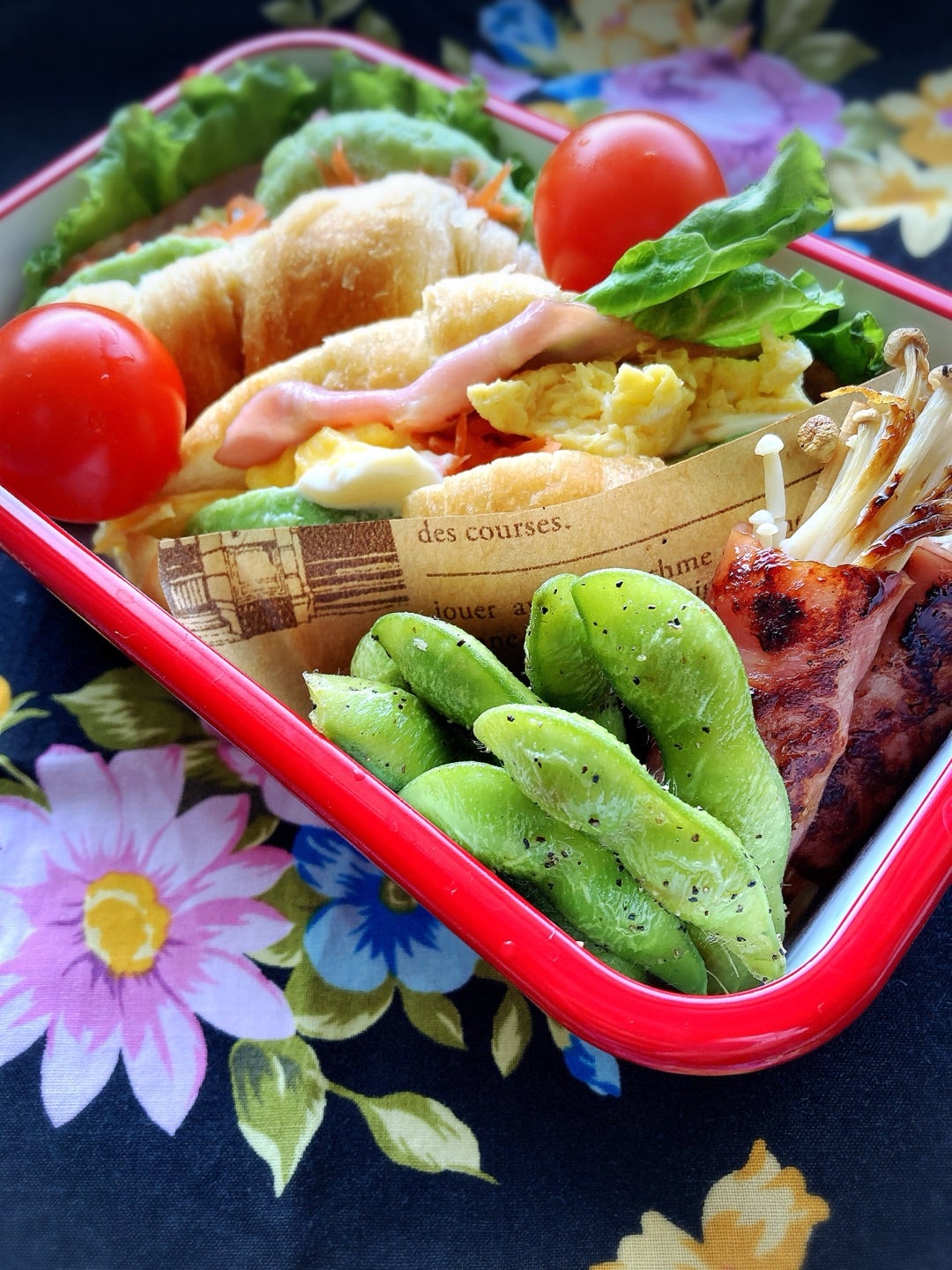 𓈒𓂂𓏸 クロワッサン弁当𓂃⟡.· レタスやキャベツのサラダが大好きな娘 いつもむしゃむしゃと無心で食べる姿は リスそのもの🐿゙ 我が家の食卓には いつも可愛いリスがおります w 今日のお弁当は大好きなレタスを 沢山入れておいたよー。