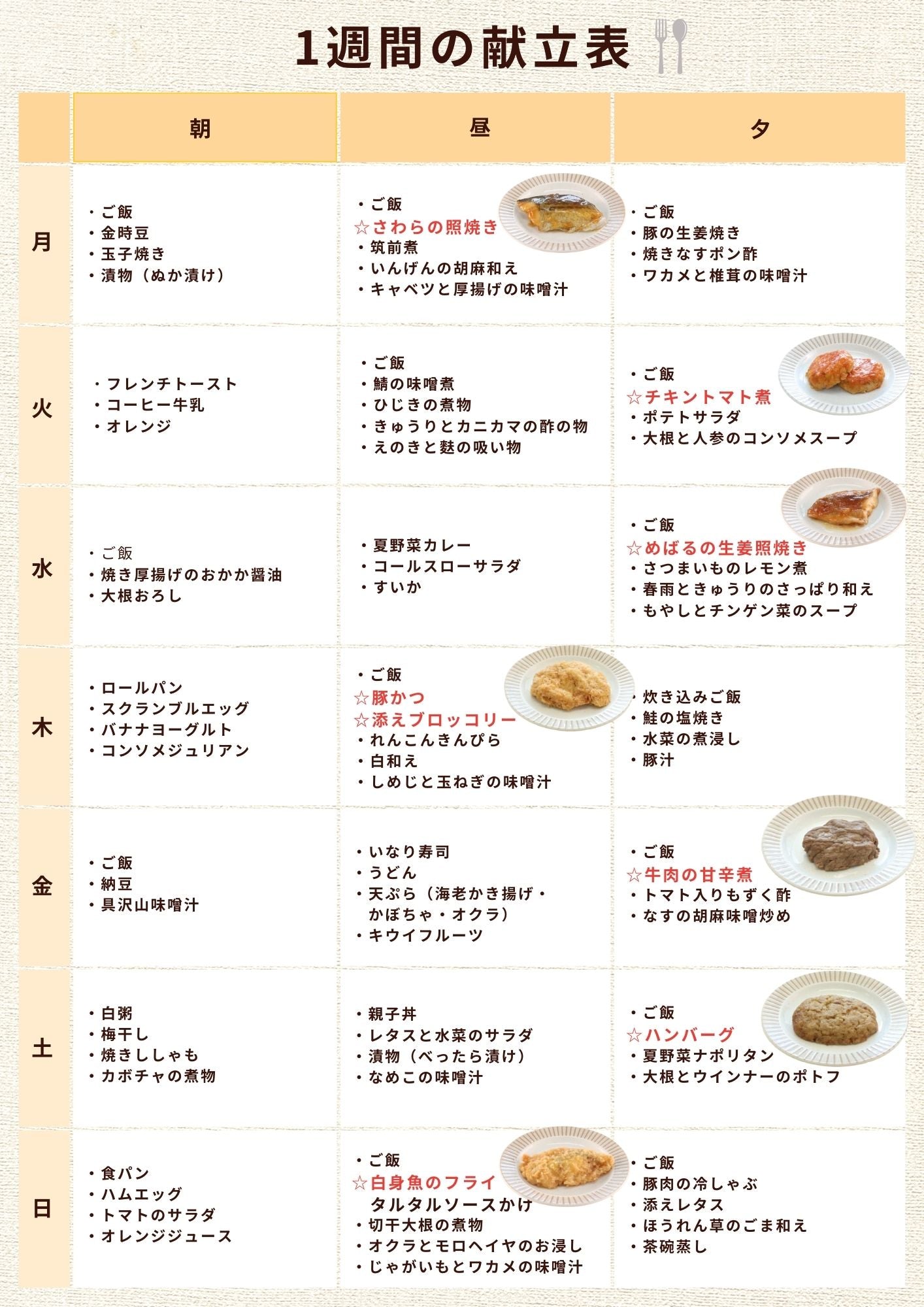 1週間の献立をご提案 メイン料理も!高齢者に向けたバランスの良い食事。