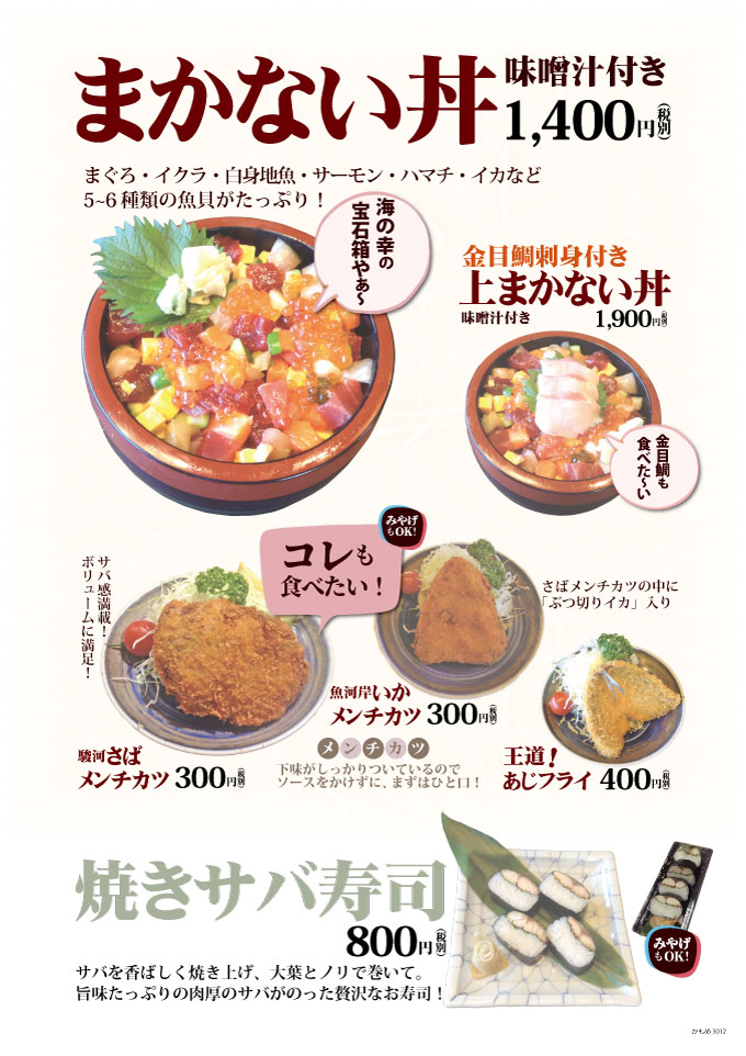 まかない丼・さばメンチカツ・焼きサバ寿司が登場!沼津港さかなや千本一&かもめ丸。