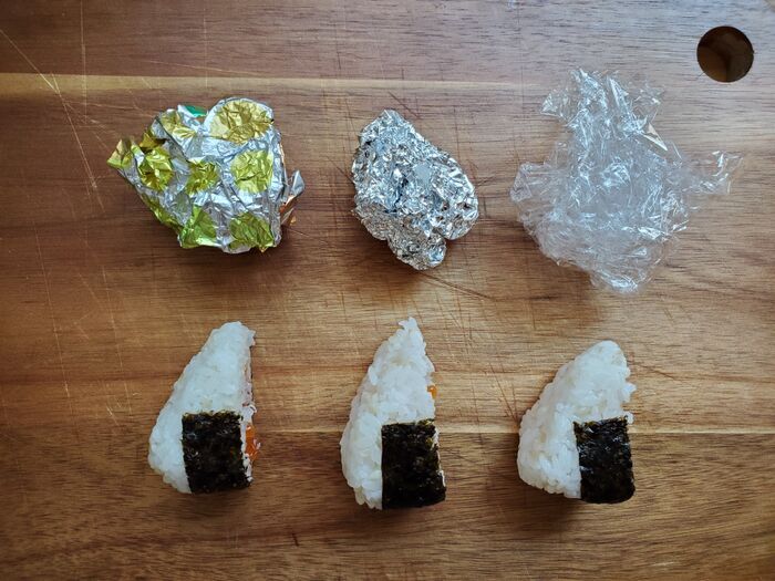 おにぎりをラップ、ホイル、クッキングシートの3種で包装。4時間後にいちばん食感がよかったのはねROOMIE ルーミー。