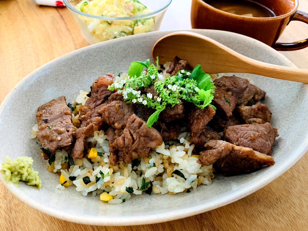 バターライスで食べる わさび醤油のステーキ丼ガーリック風味 Kaz.Snapdish スナップディッシュID:XufHfa。
