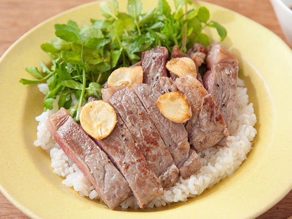 ステーキ肉をプラス! ボリュームガーリックライス丼。