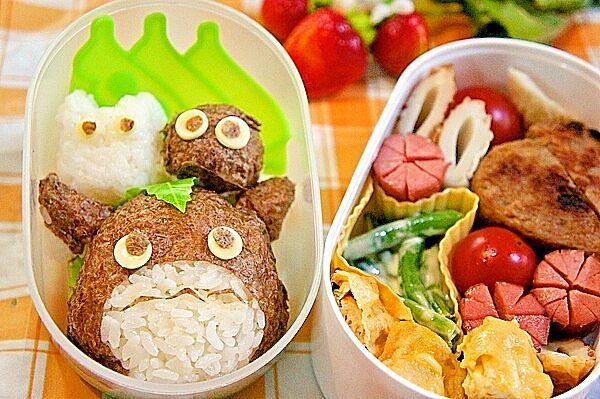 yuka** 今日のお弁当 𖦞トトロ弁当𖦞 ・トトロおにぎり ・まっくろくろすけおにぎり ・小トトロ うずらの卵・どんぐりの包み風しそ巻きハンバーグ ・どんぐりウインナー ・ひまわり ・ベビーほたての醤油バター ・ピーマンおかか ・とうもころしInstagram。