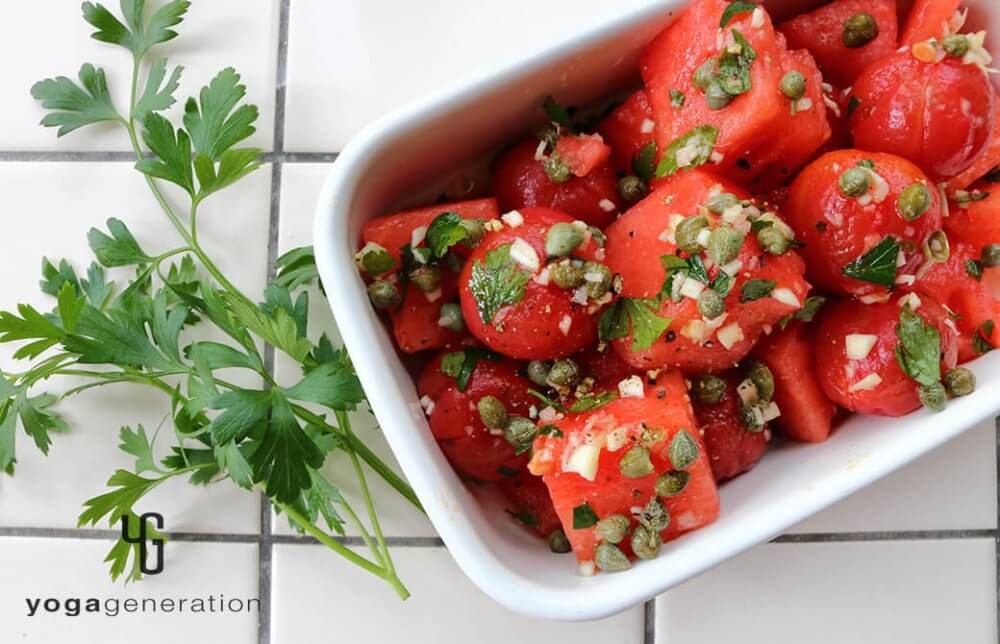 スイカとトマトのガーリック・ケイパー・サラダヨガジェネレーション yogageneration。