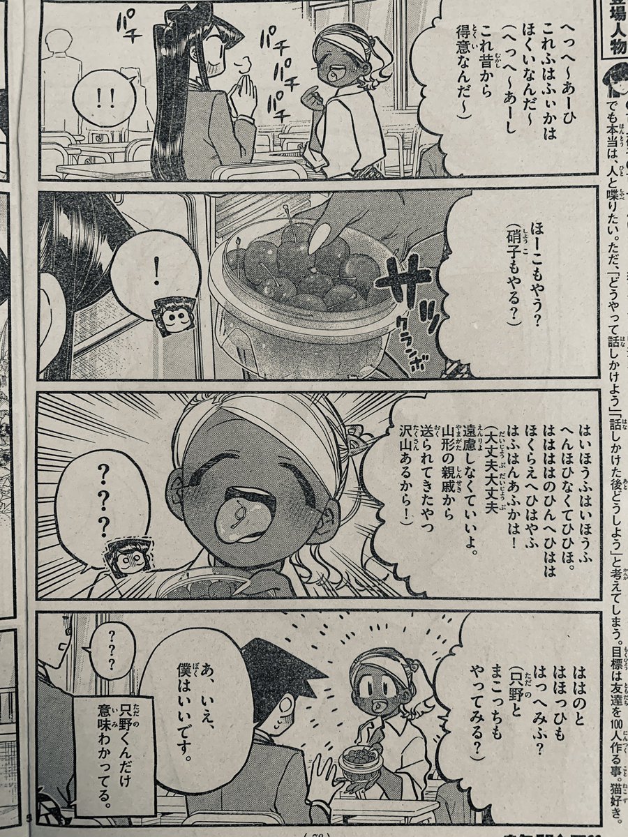 オダトモヒト on X: "ふいおうはんへー!!『ほひはん』ほってはふよ!! 水曜サンデー!!『古見さん』載ってますよ!!今週はさくらんぼ 回!!留美子ちゃんはさくらんぼのヘタを口で結ぶのが上手な様子!果たして古見さんは !? ただ舌をベッてするのが描きたかっ。