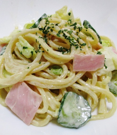 キャベツとハムの和風パスタサラダ<マヨ風味> - おうちで楽しむ簡単レシピ。