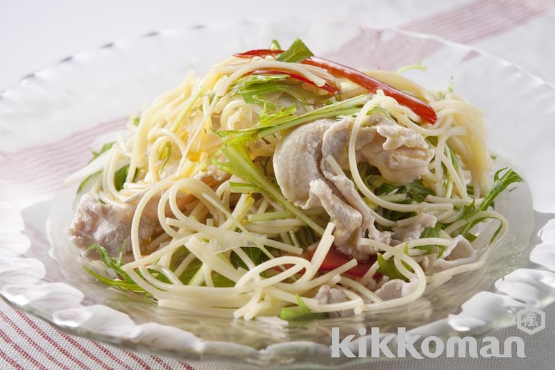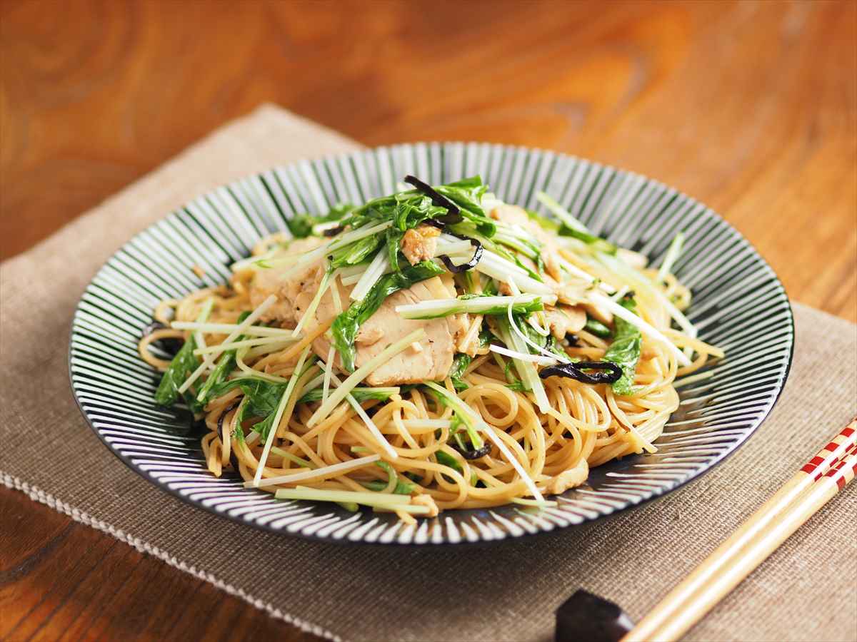 サラダチキンと水菜の和風パスタ、味付けはぽん酢しょう油、かつお出汁の素、塩昆布でお手軽! - 魚料理と簡単レシピ。