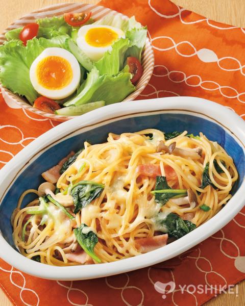 きのこの和風チーズパスタ 半熟卵のカラフルサラダ 食材宅配のヨシケイ 夕食ネット レシピ・メニュー・献立付き。