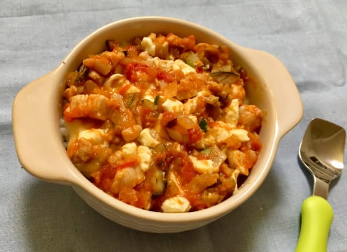 夏野菜で ラタトゥイユ ,材料 , トマト缶1缶, 鶏肉2枚, ピーマン1個, 玉ねぎ半分, ズッキーニ1本, にんじん1本, ケチャップ,ウスターソース, コンソメ, 切って入れて煮込むだけ!,お子様プレートお子様ランチ ,幼児食幼児食メニュー幼児食記録,1歳ごはん1歳児ごはん2歳ごはん2歳2歳メニュー2歳児ごはん3歳3歳ごはん。