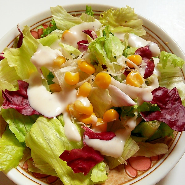 レタスとグリーンリーフと紫キャベツとコーンのサラダ。
