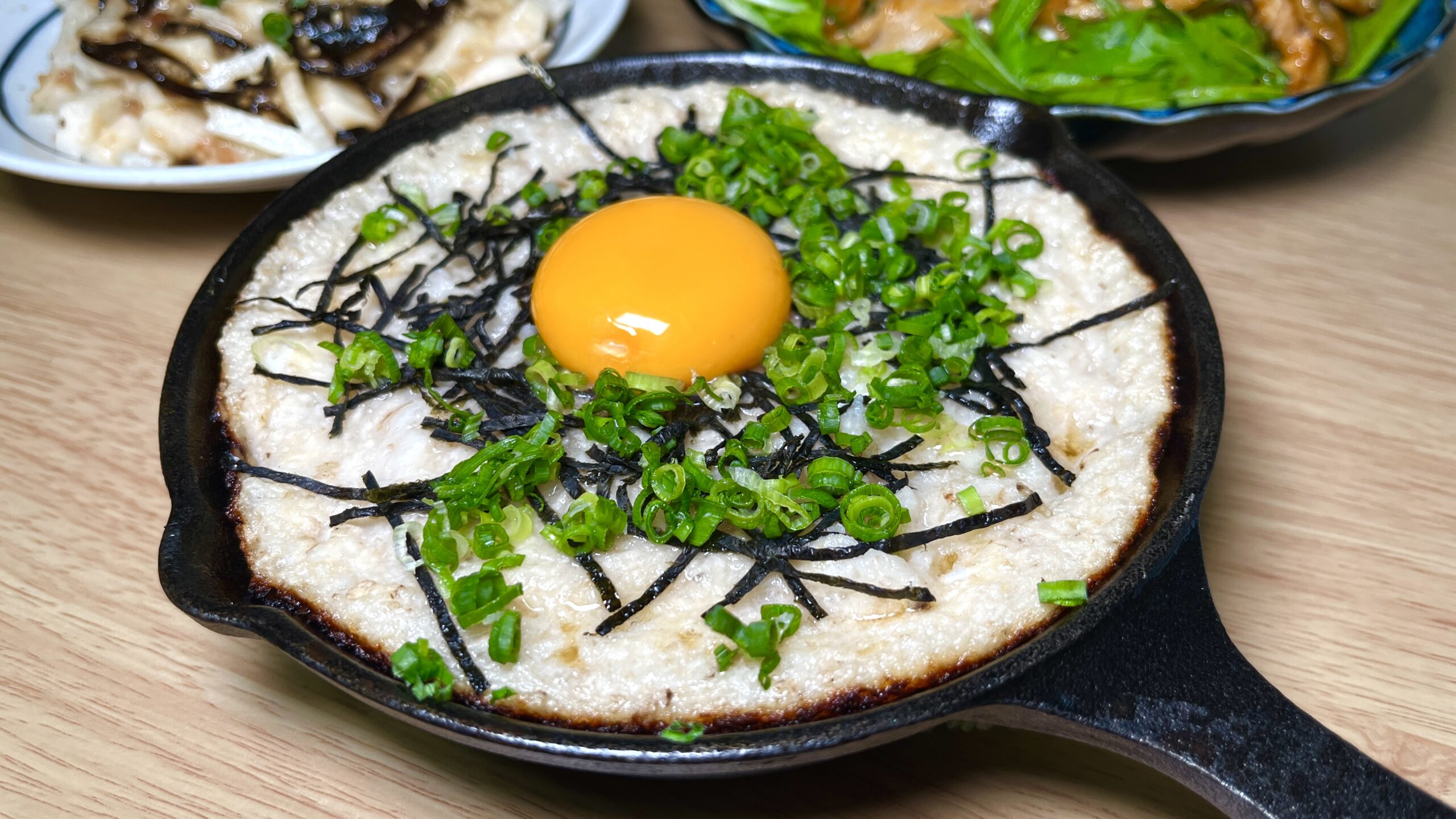 鳥貴族で食べた 長芋の鉄板焼き 感動したから再現してみました🙌 長芋 300g めんつゆ 大さじ2 かつお節 ネギ 刻みのり 卵黄 ポン酢 1.長芋をすりおろしてとろろを作り、めんつゆと混ぜておく 2.スキレット 小さなフライパン可 に油を敷き、とろろをいれて蓋をし、弱中。