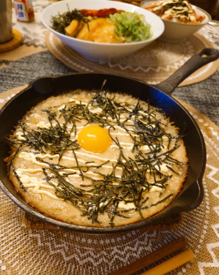 あべし on X: "鳥貴族の山芋鉄板焼きが好きすぎて再現レシピ作った✌️ 24cmフライパンで、長芋 350gすりおろし→めんつゆ大匙2顆粒だし小さじ1マヨ大さじ2と合わせよく混ぜ、ごま油を引いたフライパンに流して弱火で10分くらい焼き→マヨと刻み海苔と卵 本家はうずら。