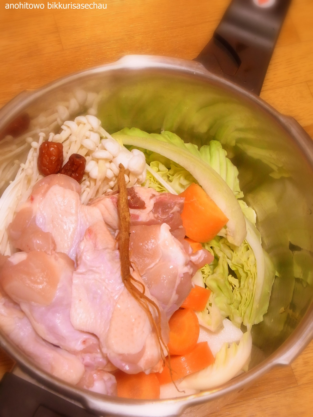 👨🍳料理好き四十路シンパパの今日のひと品👨🍳, ========================================,今日のひと品は、丸鶏でサムゲタン, 電気圧力鍋があれば、大きな丸鶏も簡単にホロホロに😁, 鶏のうまみがたっぷりつまったサムゲタン,心もカラダも温まります😊,材料 , 丸鶏1羽 2㎏程度 , 好きな野菜適量,白菜、大根、にんじん、しめじ、ネギ ,。