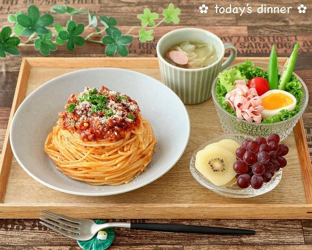 arimi on Instagram: " ごはんの記録🍴献立🍴 🍀ミートソースパスタ 🍀生野菜サラダ ゆで卵、ハム🍀キャベツとウインナーのスープ 🍀デラウェア&ゴールドキウイ こんばんは。 今日の夜ごはんはミートソースパスタです。お肉と野菜、そしてトマトの旨味たっぷり。