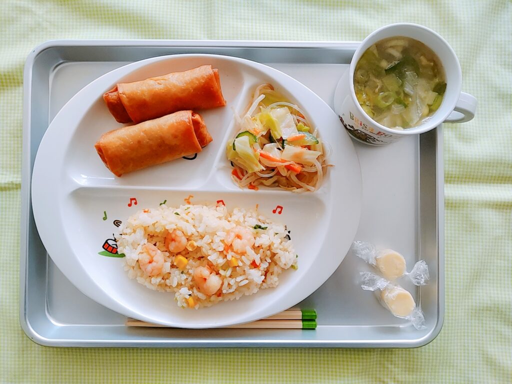 えびチャーハン、レタスの中華スープ、パリパリ春巻き、春雨サラダ、キャンディーチーズ – 聖徳大学附属浦安幼稚園。