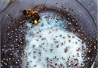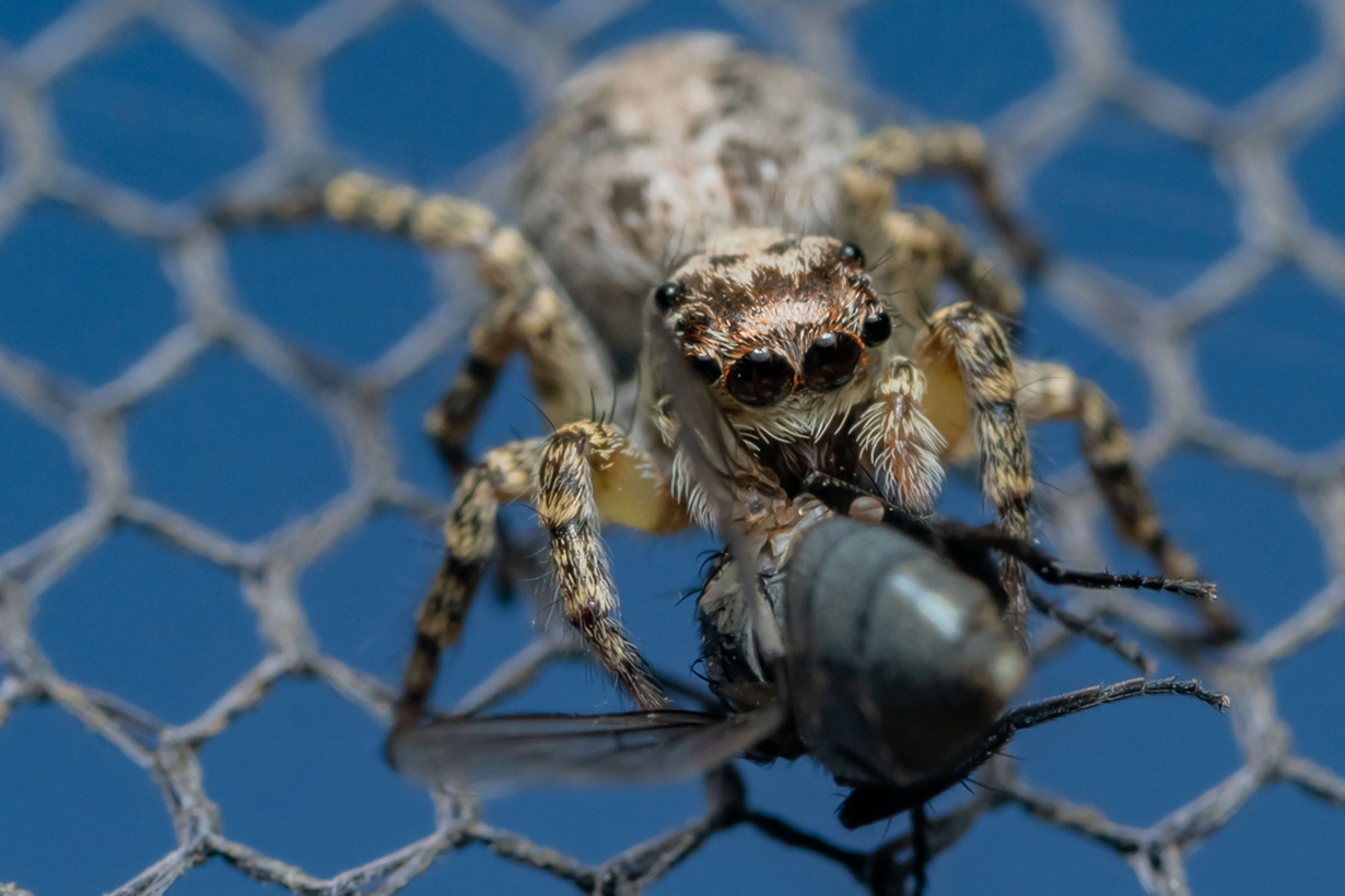 腹ペコのハエトリグモに害虫を与えてみたら、衝撃的な食べ方をした アダンソンハエトリグモ。