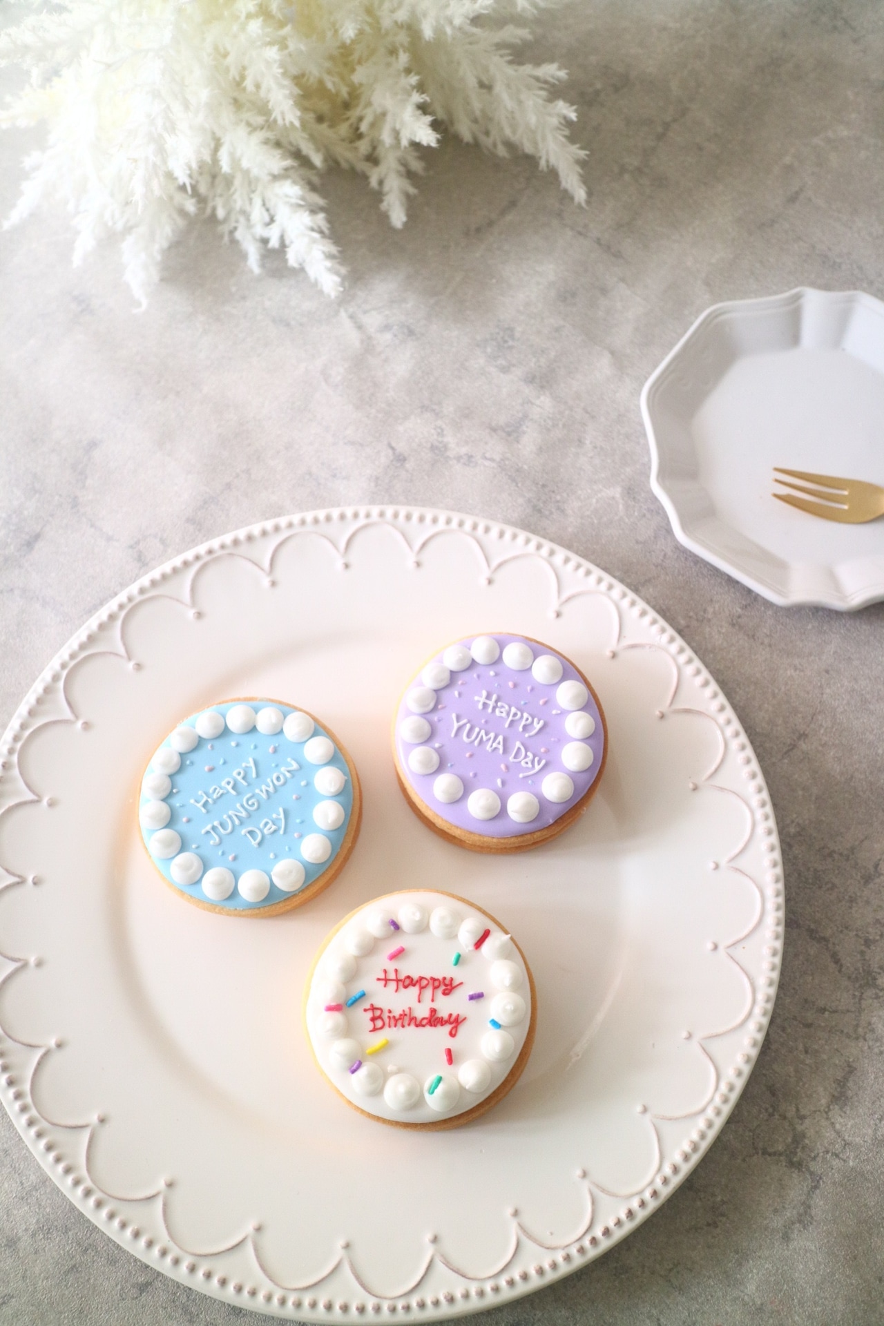 アイシングクッキーのおしゃれな誕生日デザイン!丸型プレート!おうち教室ふくふく浜松市のアイシングクッキー教室。