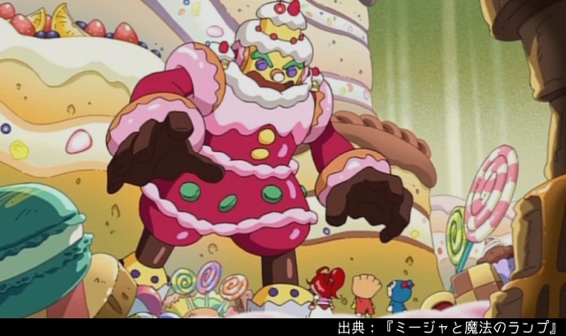 それいけ!アンパンマン ミージャと魔法のランプ」でナイツ土屋が声優を務めたお菓子の魔神。 c やなせたかし フレーベル館・TMS・NTVc やなせたかし アンパンマン製作委員会2015 - 大島優子とナイツが「アンパンマン」声優に挑戦、新キャラ“THEパン”を考案画像。