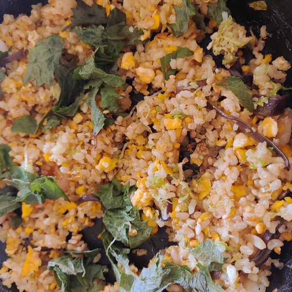 バジルのおいしい季節がやってきた! 食欲が沸き出る「エスニック風炒飯」に 素揚げにしたパリパリのバジルをオンのっけて、食べる。