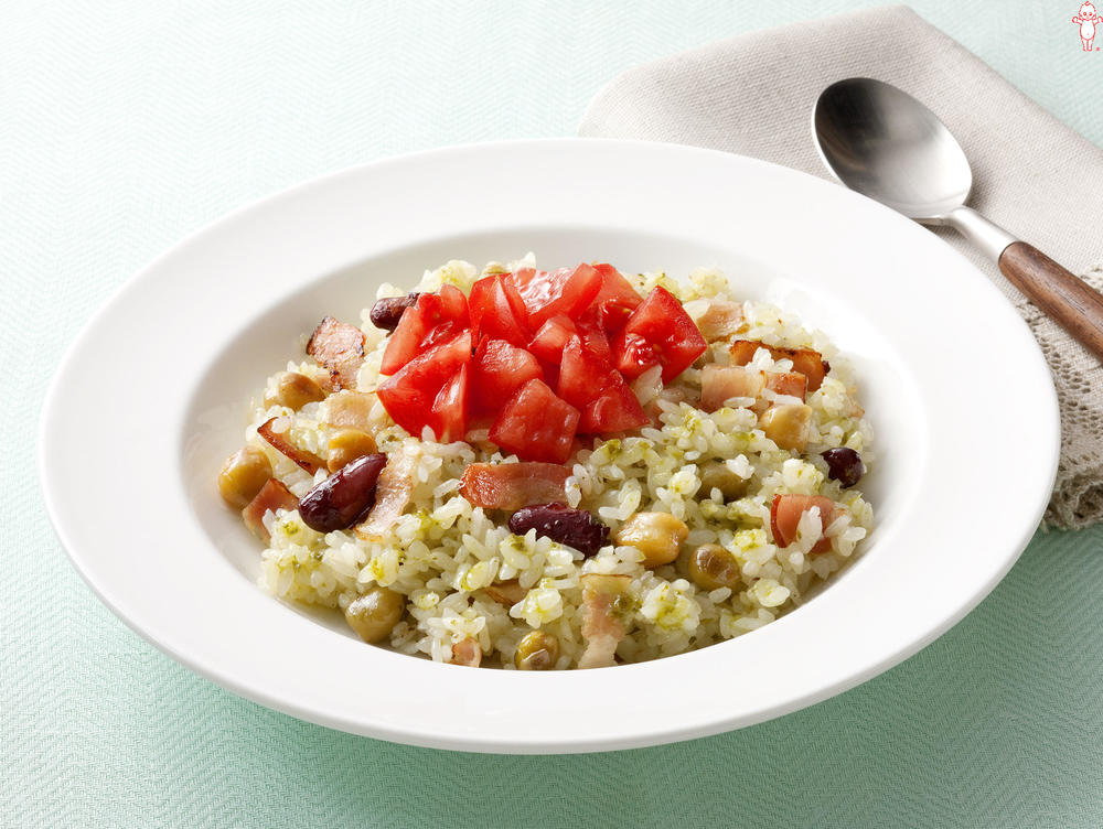 ベーコンとたまねぎのバジルチャーハンレシピピエトロ - 美味しいドレッシングとパスタを。
