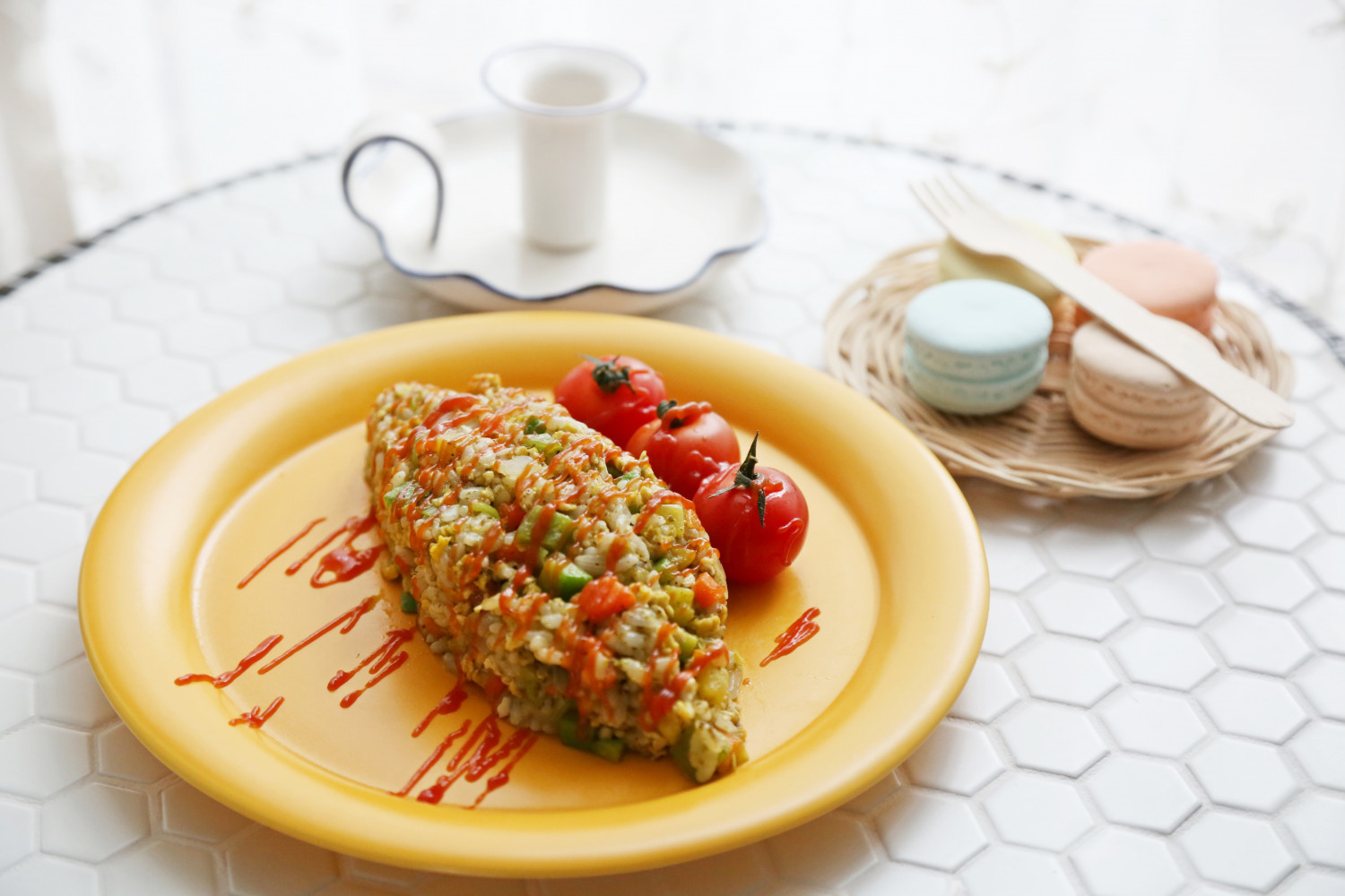 チャーハンに、バジルが香るオムレツをのせてスパイスとハーブと栗原はるみ。