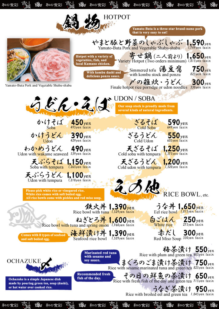 English menu is available 英語併記メニューご用意しております 新宮市グルメ 和食・居酒屋「和の食彩 古城」。