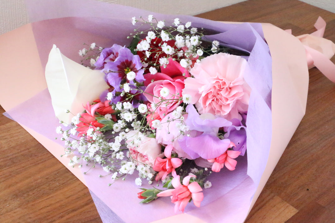 ふんわり優しい雰囲気に「パープルとピンクの花束」 - 品川区武蔵小山の花屋 spice フラワーギフトを全国へ。
