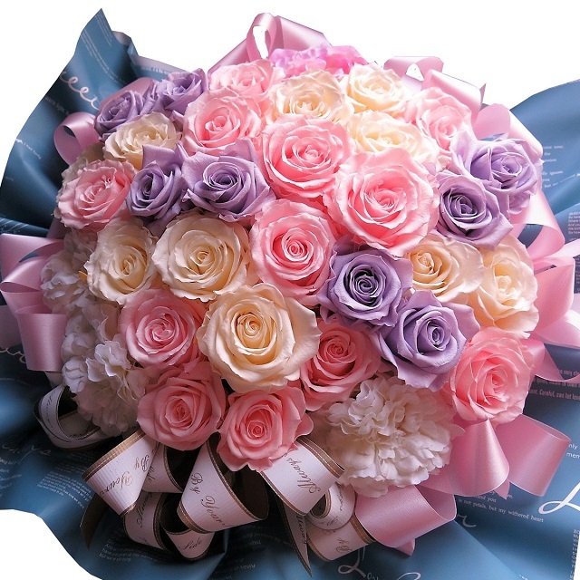 大きな花束 バラ いっぱい 花束風 カラフル 特大ケーズ入り 紫バラ ピンクバラ 白バラ 枯れない プリザーブドフラワー入りギフト 30㎝×40㎝ケース付き ◇誕生日プレゼント・記念日の贈り物におすすめのフラワーギフト -フラワーガーデン リーブス - プレゼント。