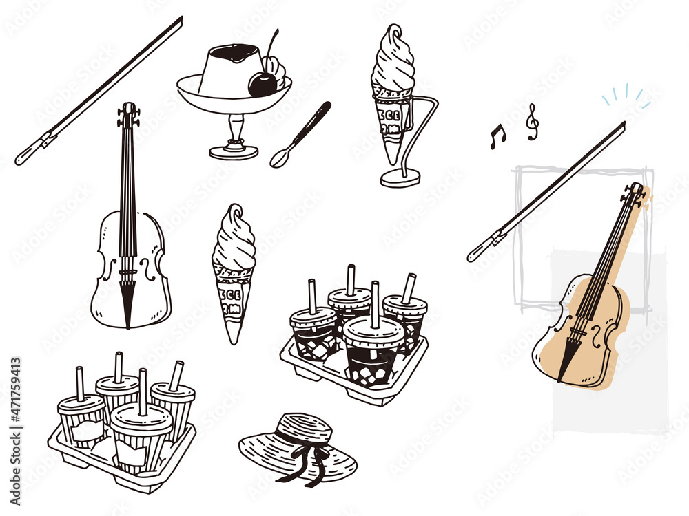 白黒、モノトーン、線画のイラスト 手書き、アイスクリーム、アイスコーヒー、テイクアウト、プリン、バイオリンIllustrations ofblack and white, monotone, and line drawings.Handwritten, ice cream, icedcoffee, pudding, violin. Stock VectorAdobe Stock。