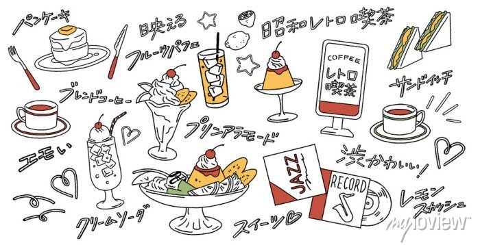 レトロ喫茶のプリンアラモード、パフェ、パンケーキ、クリームソーダ、レコードのベクター手描きイラスト素材や、エモい・映えるなどの手書き日本語文字fotomural • fotomurais moda, doce, 70myloview.com.br。