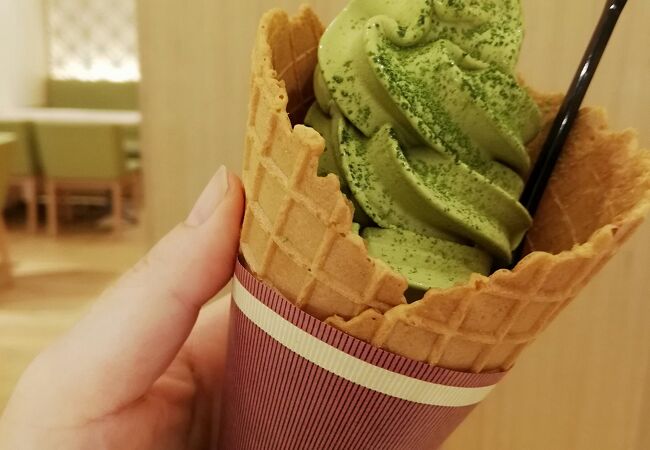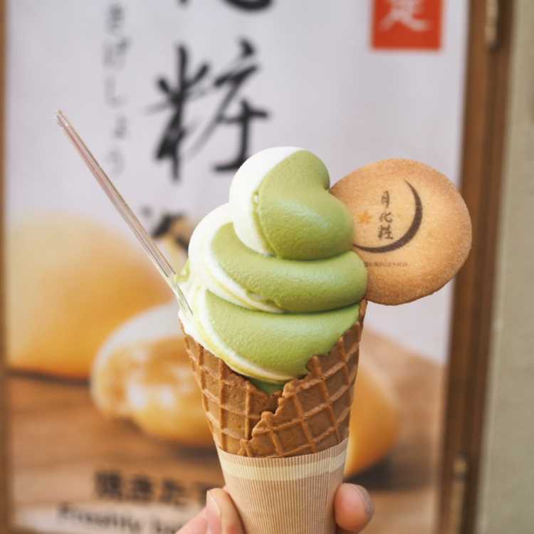 大阪 難波 月化粧なんば店 大阪名物バター&ミルクたっぷりのお饅頭のお店で、全国唯一焼きたての月化粧を味わえる&ソフトクリームもなんば店限定🍦✨オリジナルブレンド抹茶ソフトは苦味のない甘めの抹茶ミルクな仕上がりで、月化粧クッキーと相性抜群です😋 バニラは。