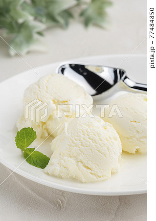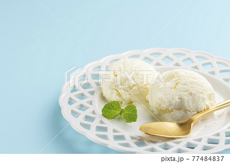 皿に盛り付けられたバニラアイスクリームの写真素材77484837- PIXTA。