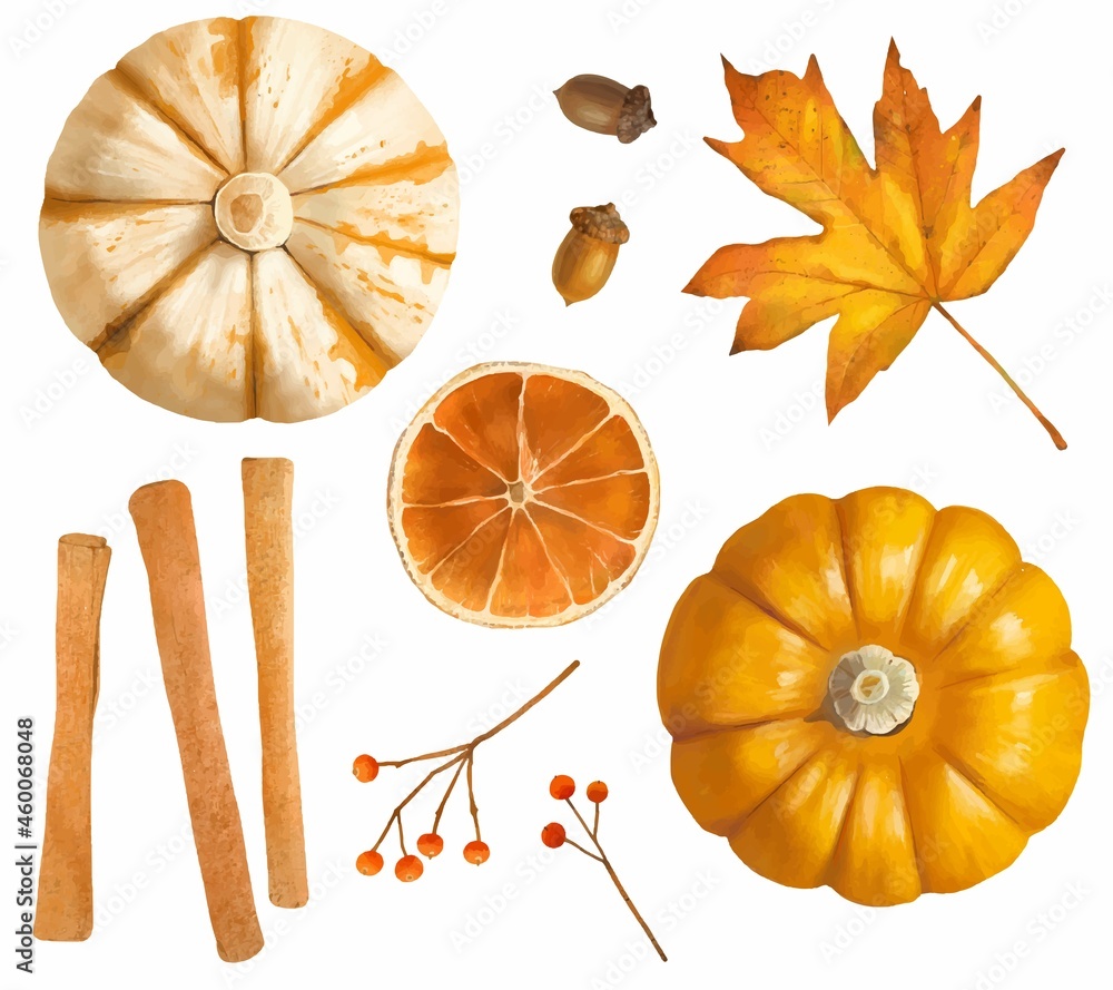 オシャレでリアルなかぼちゃや木の実やドライフルーツなど秋の彩りグッツベクターイラスト素材 Stock VectorAdobe Stock。