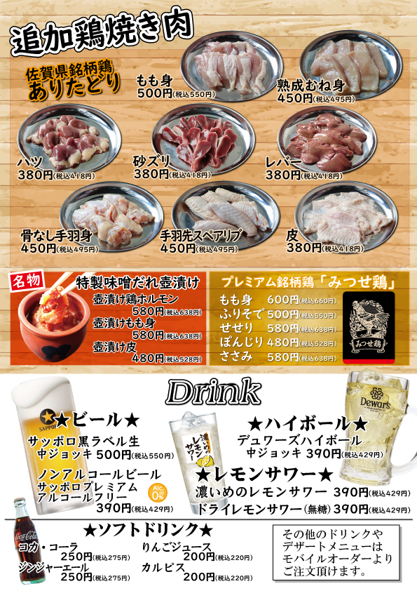 鶏焼肉 ザ・トリフターズ メニュー – 彩玉家-みそだれやきとりひびき-。