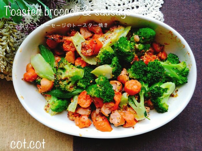 ソーセージをちぎって旨味アップ!!ブロッコリーとソーセージのトースター焼き。