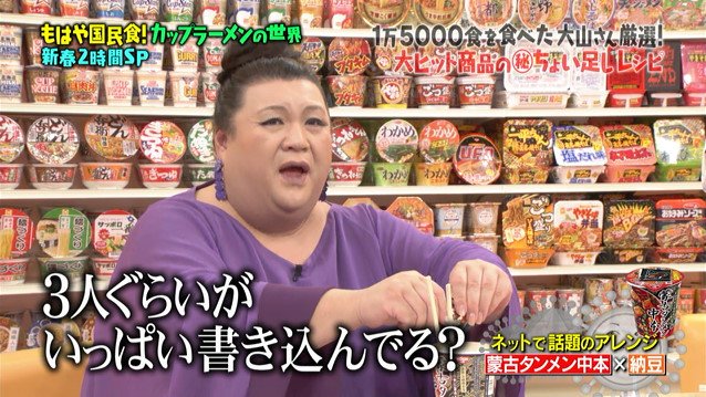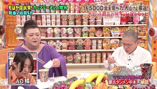 大山 即席斎≡◔ω◔≡ on X: "昨日、マツコの知らない世界 のCMを見てたら、次回は食回の編集版で、蒙古タンメン中本 のカップに納豆を入れる場面が使われていた。コロナによりTV制作の現場も影響を受けまくりのようで、再放送や編集版が増えるそうだが、こちらは大。