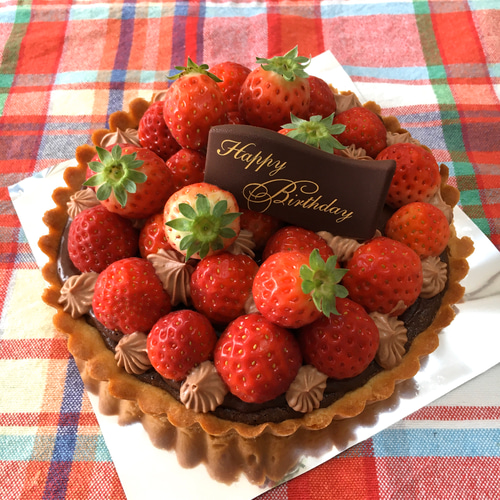 生チョコタルト イチゴとマカロンのせ ありがとうございました♥️ 、オーダーケーキ加賀市 バースデーケーキ生チョコタルト。