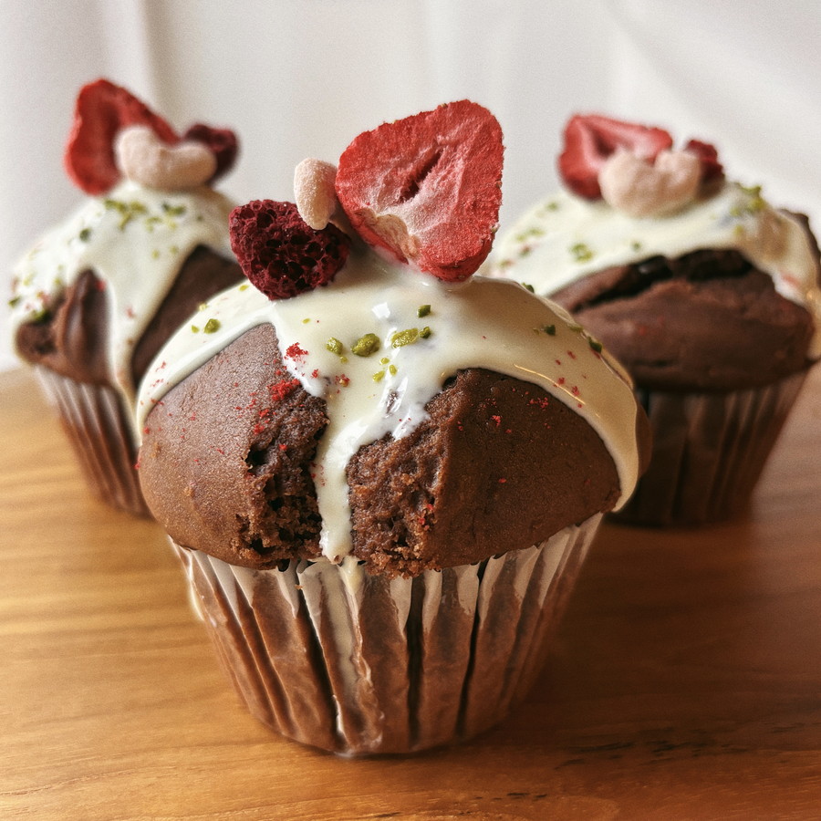 MIHO NAMBAチョコマフィン かわいいデコレーションを 研究するのが最近のマイブーム😙 色々試した中でも めちゃめちゃかわくてお気に入りなのが この子たち❣️❣️ ココア生地のマフィンに ホワイトチョコ ドライいちごフレークを散らします 基本的なレシピに 一手間。