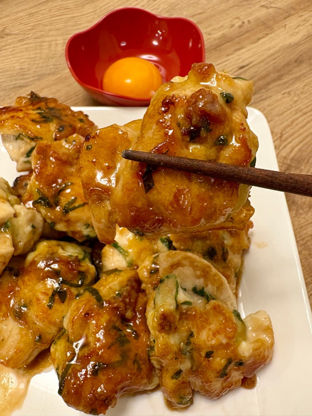 卵黄で濃厚に! 鶏むね肉の大葉柚子こしょうつくね。