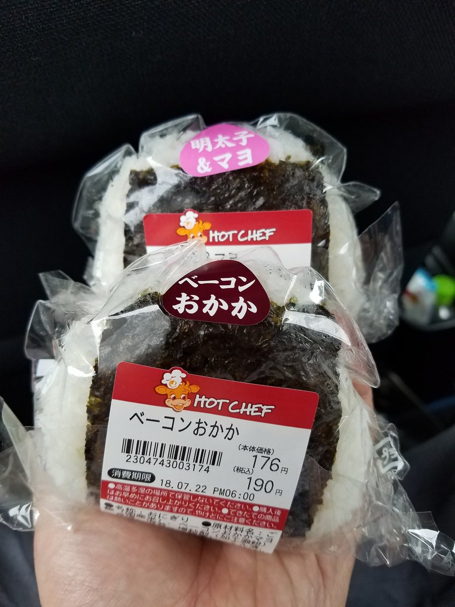 北海道絶景ロードセレクション「Hokkaider ホッカイダー 」 - 朝食兼昼食は、 セイコーマートのホットシェフおむすびシリーズ。おかかシリーズ勢揃い^_^ベーコンおかか、チーズおかか、玉子&おかか。 お腹いっぱい!Facebook。