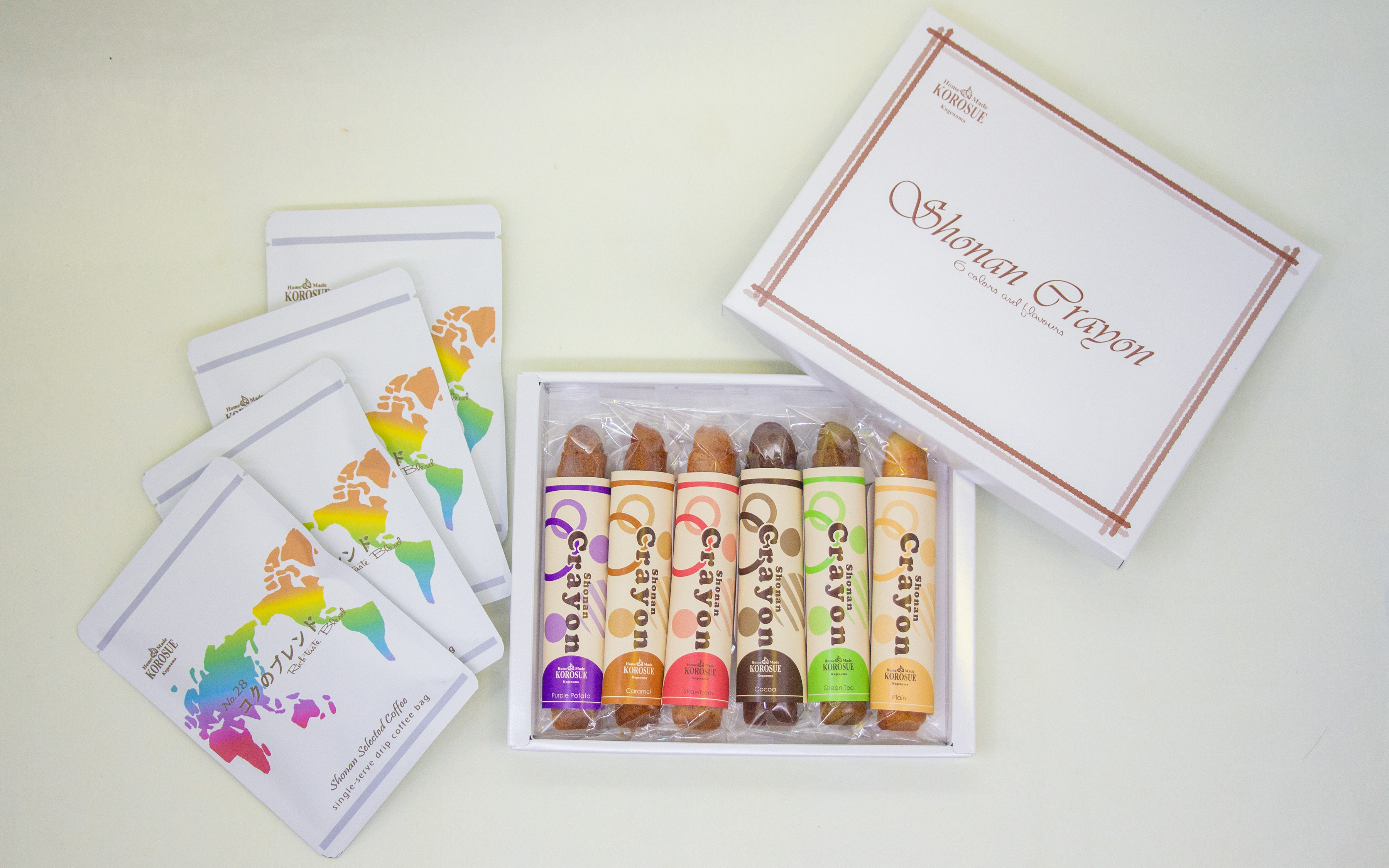 湘南クレヨン1箱・自家焙煎コーヒー ドリップパック 4袋セット 洋菓子 コーヒー セット バレンタイン アーモンド ココア 手作り お菓子 おかし 焼き 菓子 焼菓子 スイーツ おやつ 詰め合わせ ギフト プレゼント 贈答 菓子工房KOROSUE 神奈川 湘南 藤沢。
