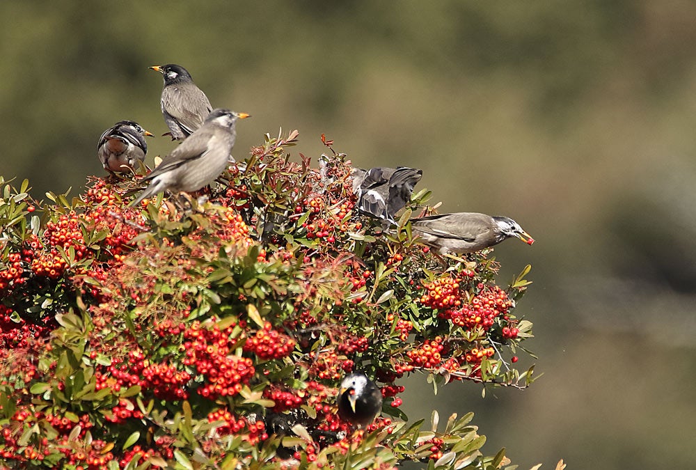 ムクドリの群れ ピラカンサの実を食べる西の京散歩。